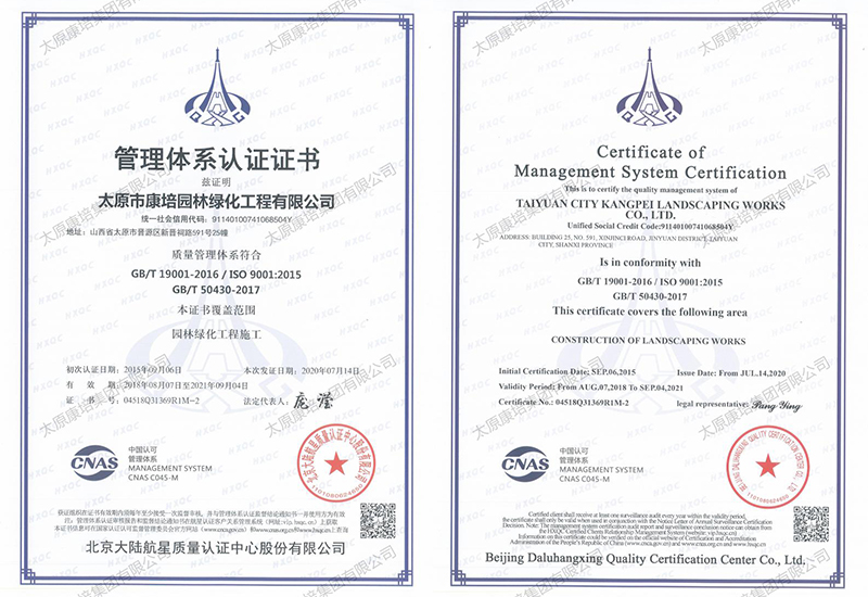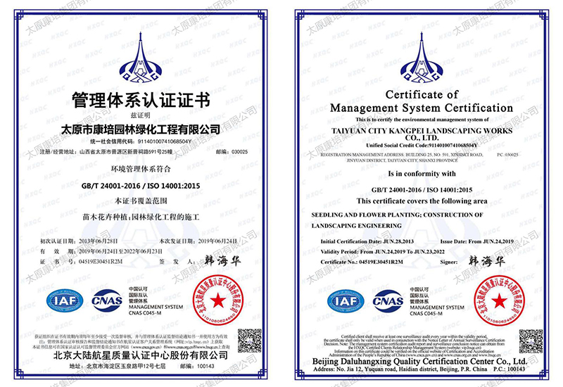 公司現(xiàn)有施工機(jī)械2000余臺(tái),在太原、忻州、晉中、運(yùn)城等7個(gè)地市有苗木基地,擁有從花卉苗木培育到園林景觀綠化測(cè)繪施工再到養(yǎng)管維護(hù)的園林景觀綠化和生態(tài)環(huán)境修復(fù)全產(chǎn)業(yè)鏈,完成和參與了包括省、市重點(diǎn)工程在內(nèi)的1000余項(xiàng)園林景觀綠化、道路綠化、城市改造、市政工程和生態(tài)環(huán)境綜合治理工程,施工足跡遍布全省,超百項(xiàng)工程獲得國(guó)家、省、市優(yōu)質(zhì)工程表彰,通過(guò)了ISO9001質(zhì)量管理體系認(rèn)證。