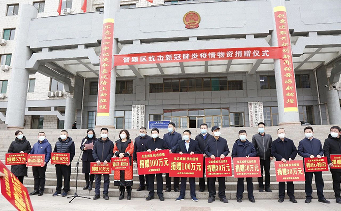 2月14日上午,在晉源區(qū)“獻(xiàn)愛心抗疫情捐贈儀式”上,集團(tuán)董事長康偉代表康培集團(tuán)在晉源區(qū)抗擊新冠肺炎疫情物資捐贈儀式上捐款100萬元、捐贈醫(yī)用口罩18000個。